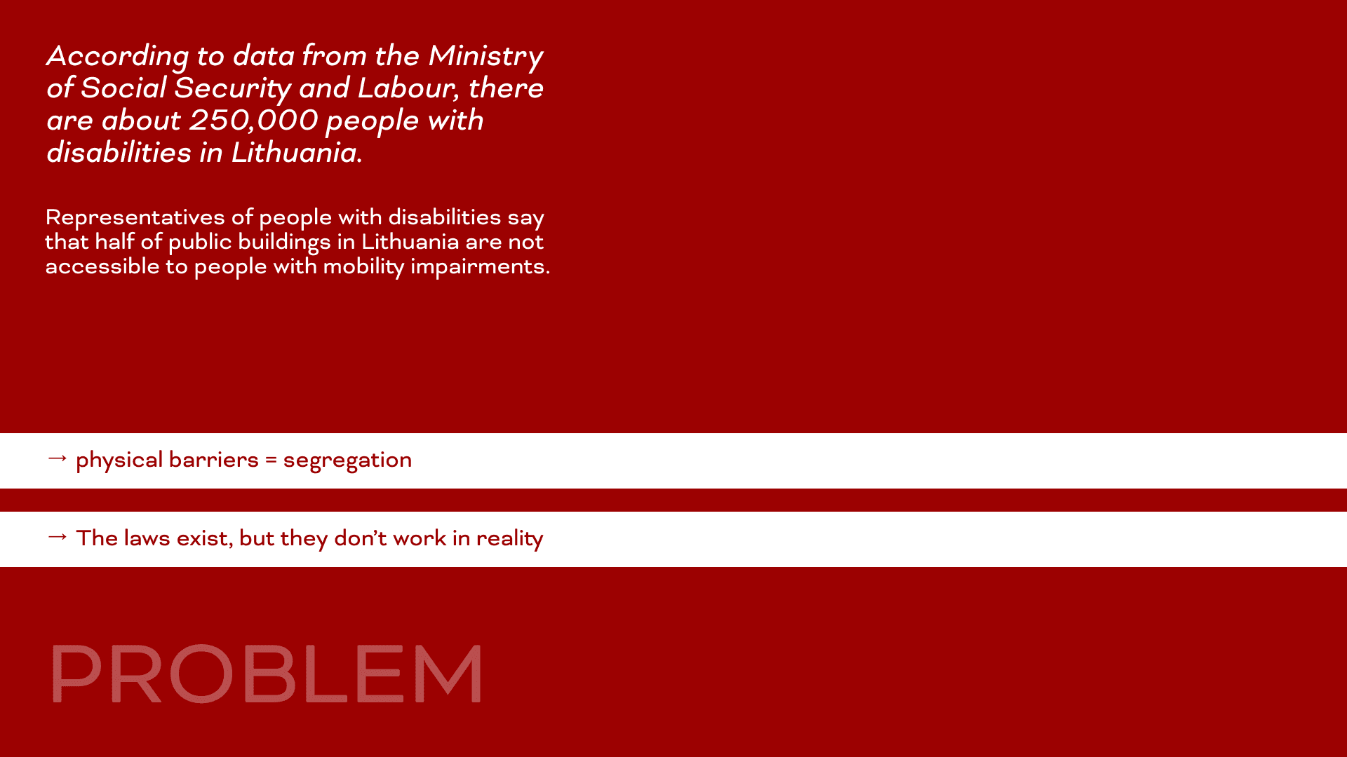 Diskriminantas – a social design campaign aimed at raising awareness about the challenges faced by people with mobility impairments in Vilnius. The campaign primarily communicated through social media and quickly captured public attention, highlighting that this is an important topic that needs discussion.